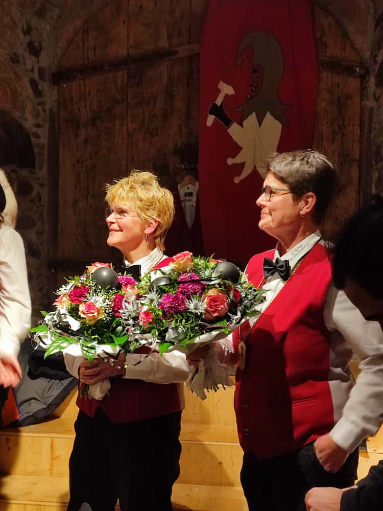 Bei den anstehenden Neuwahlen wurde der Narrenrat bis auf wenige Ausnahmen wiedergewählt. Austritte gab es von Heike Eh und Simone Fischer, für deren jahrelange Unterstützung sich der Oberzunftmeister mit einem Blumenpräsent bedankte.