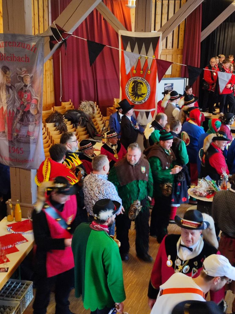 Schon am Vormittag ging es feierlich los. Pünktlich um 11:11 Uhr luden die Silberklopfer zum Zunftmeisterempfang ein. In entspannter, aber erwartungsfroher Runde wurden herzliche Glückwünsche entgegengenommen und Gastgeschenke ausgetauscht. Es war der perfekte Auftakt, um sich auf das einzustimmen, was am Mittag folgen sollte. Zeitgleich wurden die Stände im Narrendorf eröffnet.