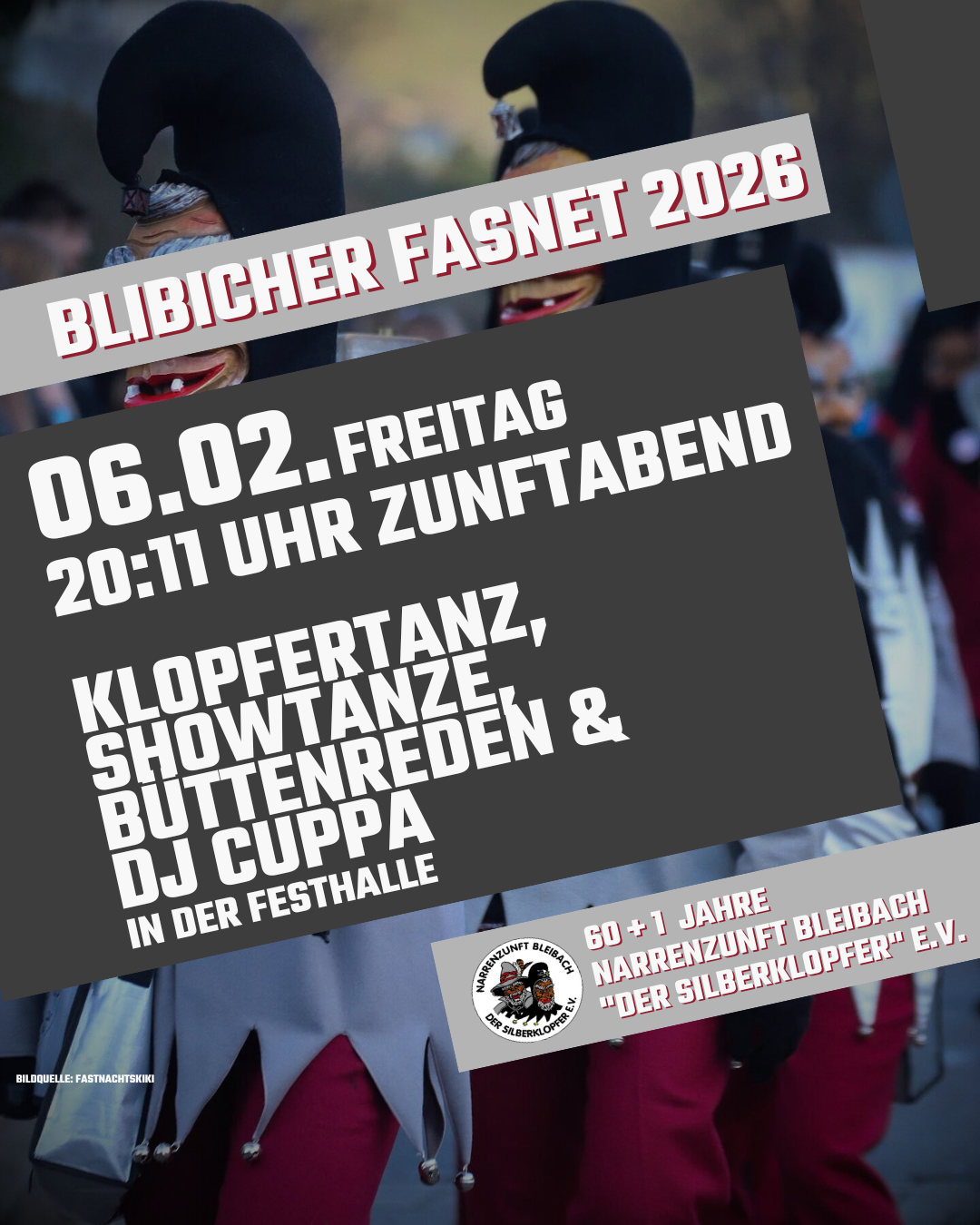 Am Freitag, den 06.02. findet unser diesjähriger Zunftabend in der Festhalle Bleibach statt.